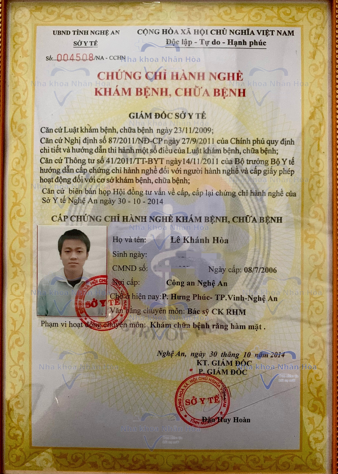 Thạc Sĩ - Bác Sĩ. Lê Khánh Hòa người đã có gần 20 năm kinh nghiệm trong làm việc trong ngành Răng Hàm Mặt. Là chuyên gia phục hình răng Implant, răng sứ, niềng răng, dán Veneer nổi tiếng tại TP.Vinh- Nghệ An.